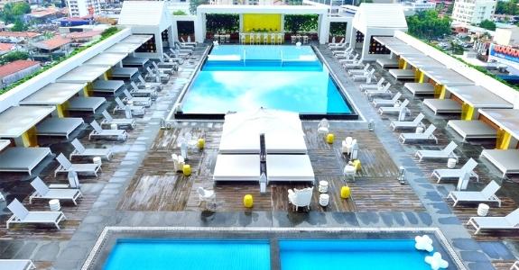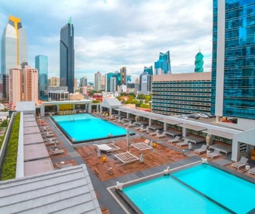 Among the amenities offered by Yoo Panama, you find the double-height lobby with elegant valet parking, huge swimming pools for adults and children surrounded by day cabanas, a beautiful rooftop garden with views of the Panama City and the Pacific Ocean, two double-height multipurpose rooms, four meeting rooms, a library, fully equipped gym with separate areas for cardio and weights, squash courts, yoga and pilates, and spa.
